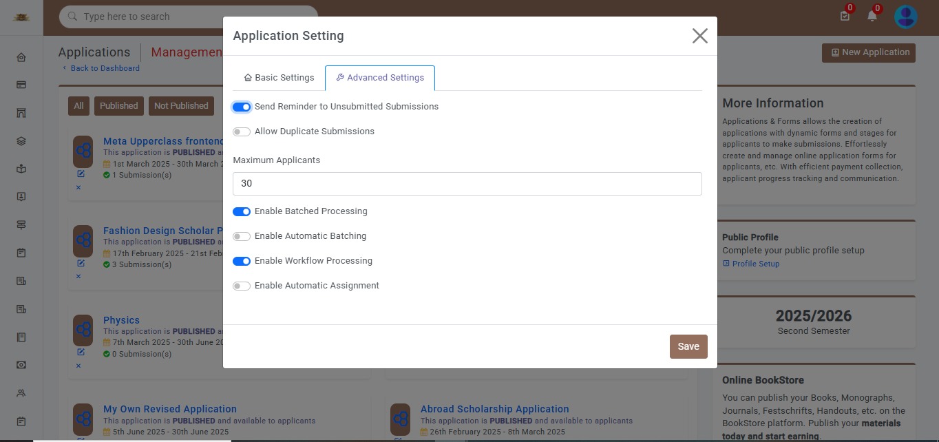 + Academic Program Admissions - A professional training center uses the module to collect and manage applications for diploma courses, complete with document uploads and progress tracking.