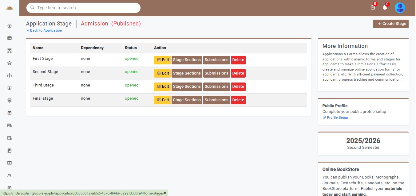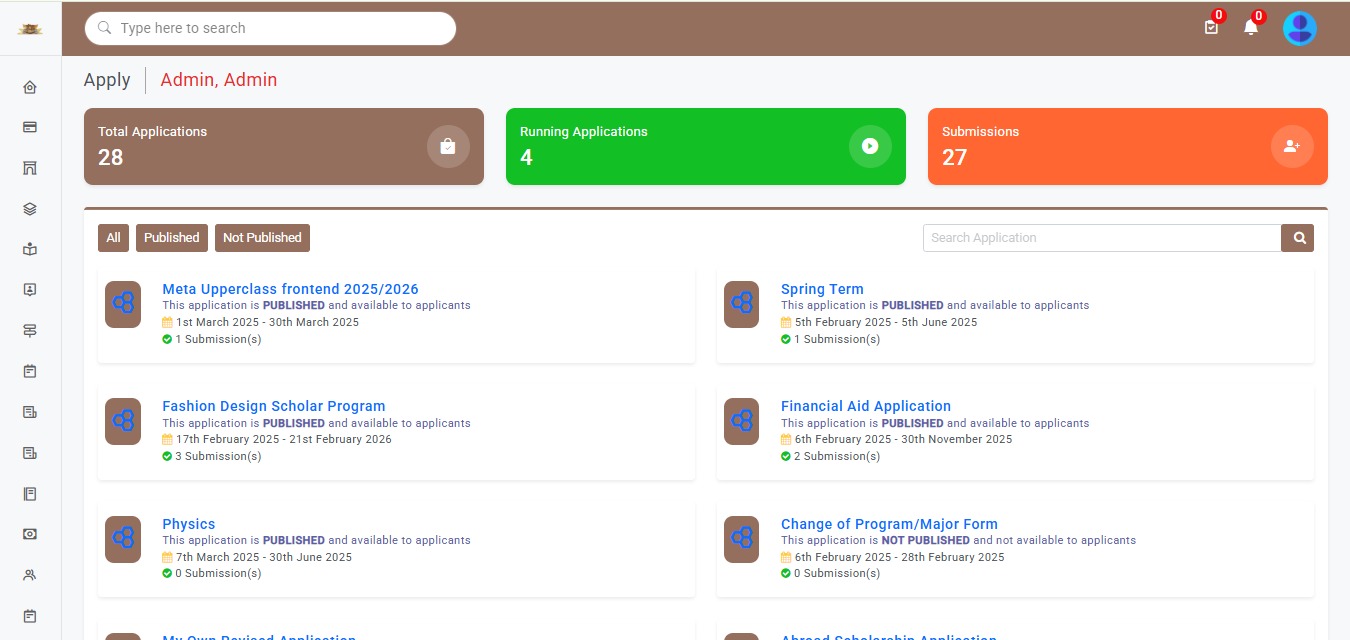 Scola’s Application Module streamlines the entire application process for educational institutions and scholarship bodies. Administrators can effortlessly create, publish, and manage various application types—ranging from course admissions to scholarship requests, financial aid, program changes, and more. Each application can be customized with its own timelines, eligibility criteria, and required documents. Users can view the total number of applications, monitor which ones are actively running, and track submission counts in real time through an intuitive dashboard. Applicants enjoy a simple, guided experience: they can browse available applications, submit necessary details securely, and receive confirmation upon successful submission. Whether it's for a single term or a year-long program, the Application Module ensures transparency, efficiency, and better data organization for both students and administrators.