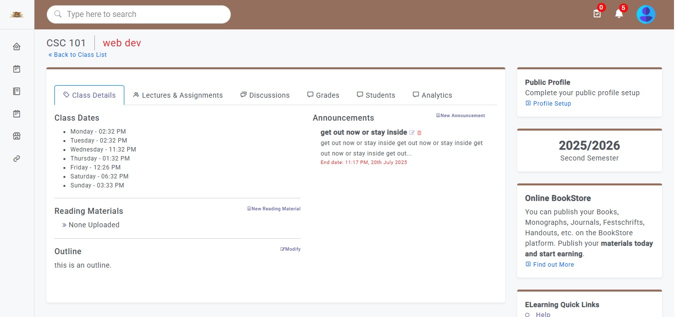 The e‑Learning module transforms how institutions deliver, manage, and scale digital education. With support for asynchronous and synchronous learning, this module provides a flexible environment for teachers to deliver structured content, assignments, and assessments, while giving students 24/7 access to course materials, discussions, and feedback. Built to mirror classroom dynamics while leveraging the advantages of technology, the e‑Learning module enables seamless online education without sacrificing quality or engagement.