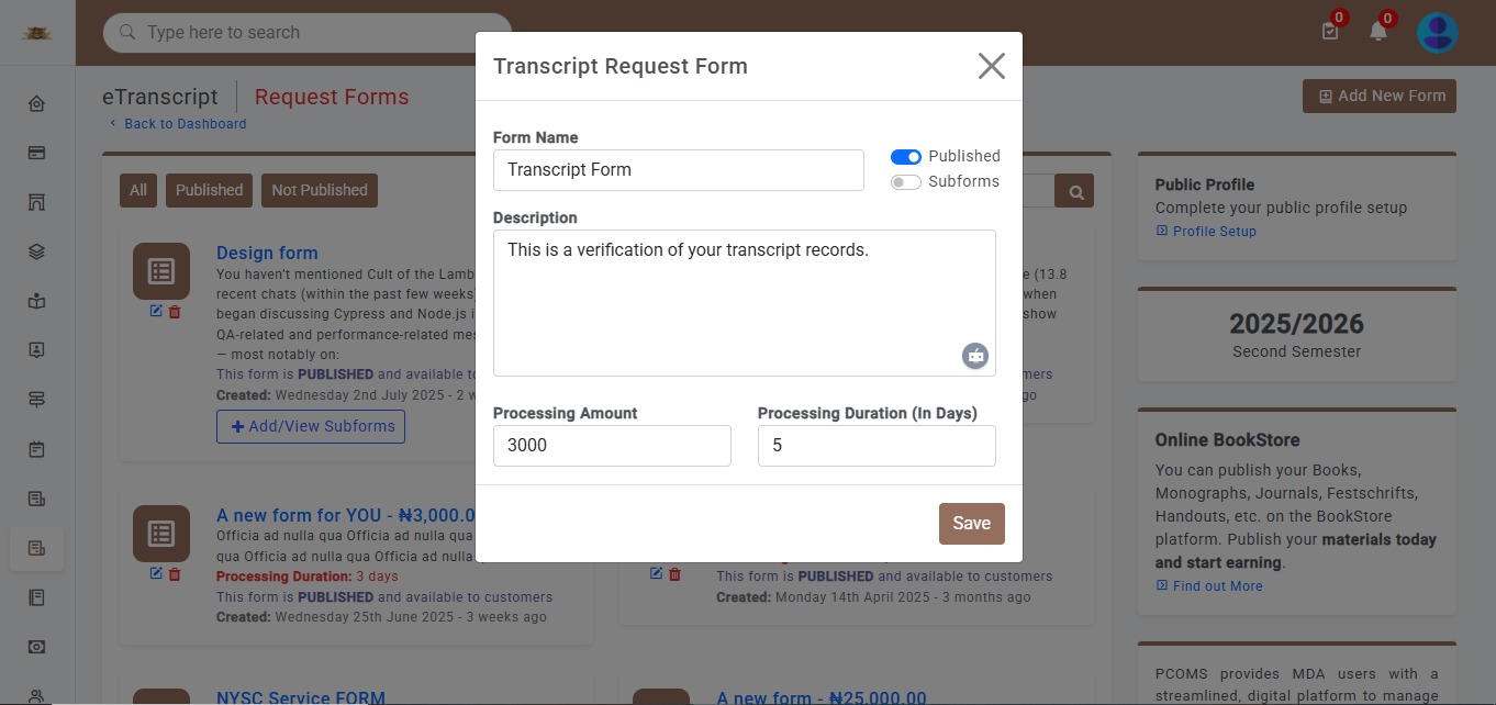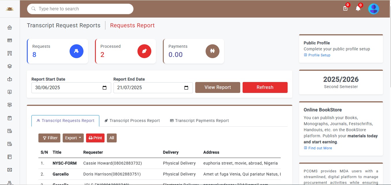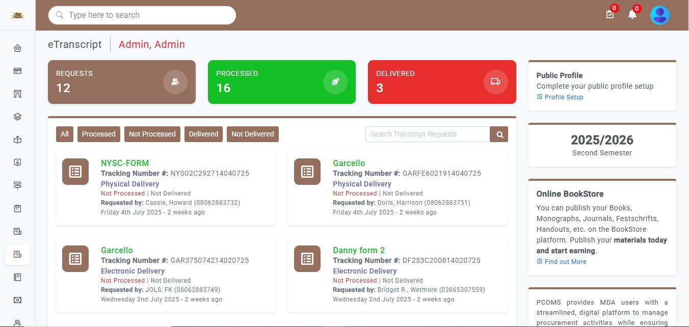 The e‑Transcript module offers a fully digitized system for transcript generation, processing, and delivery. It removes the delays and inefficiencies of manual transcript handling by allowing graduates and current students to request, pay for, and track transcript applications online. Academic units and registrars can verify records, approve details, and dispatch official transcripts—securely and without paperwork. Whether transcripts are being sent locally or internationally, this module ensures faster, more reliable academic document delivery.