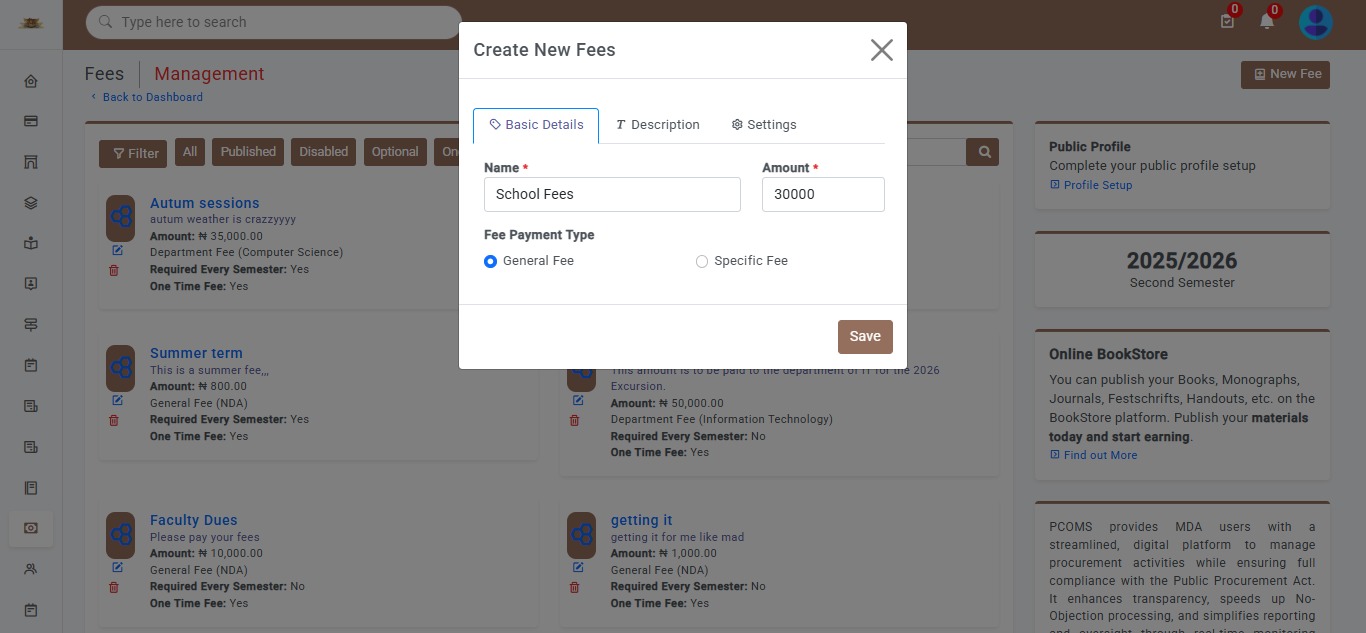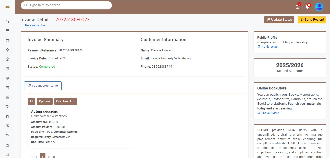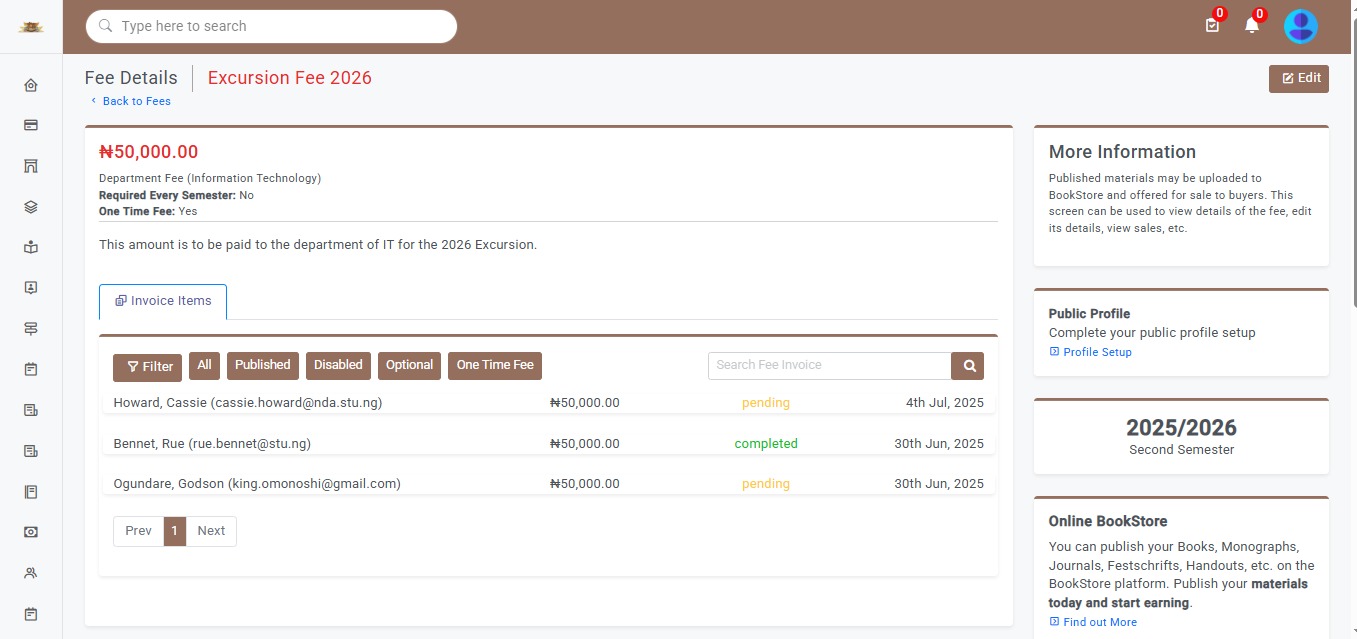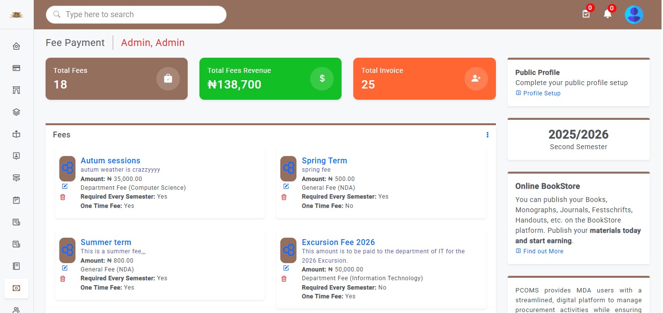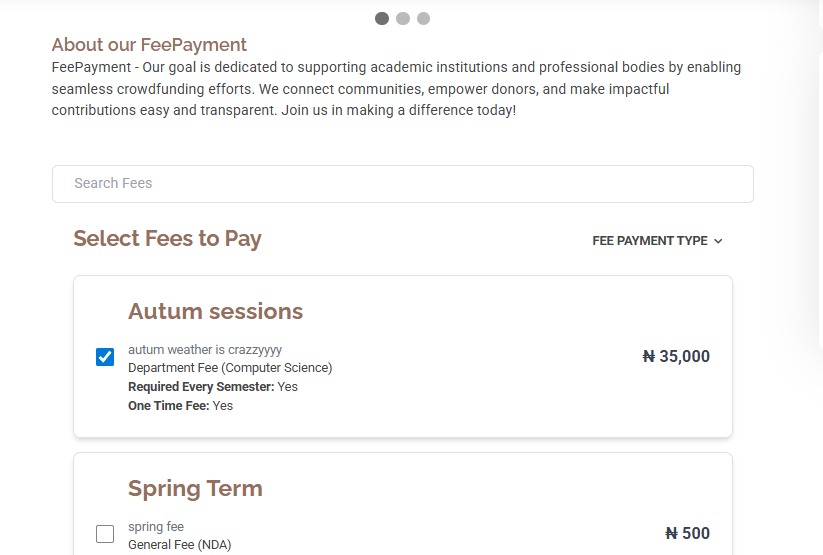 The Fee Payment module provides a secure and transparent system for managing payments within institutions. Whether it’s tuition, membership dues, training fees, service charges, or event payments, this module enables users to pay conveniently online, track their transaction history, and receive instant confirmations. Designed for flexibility, it supports one-time, recurring, or structured payment plans, giving institutions full control over how fees are set up, collected, and reconciled.