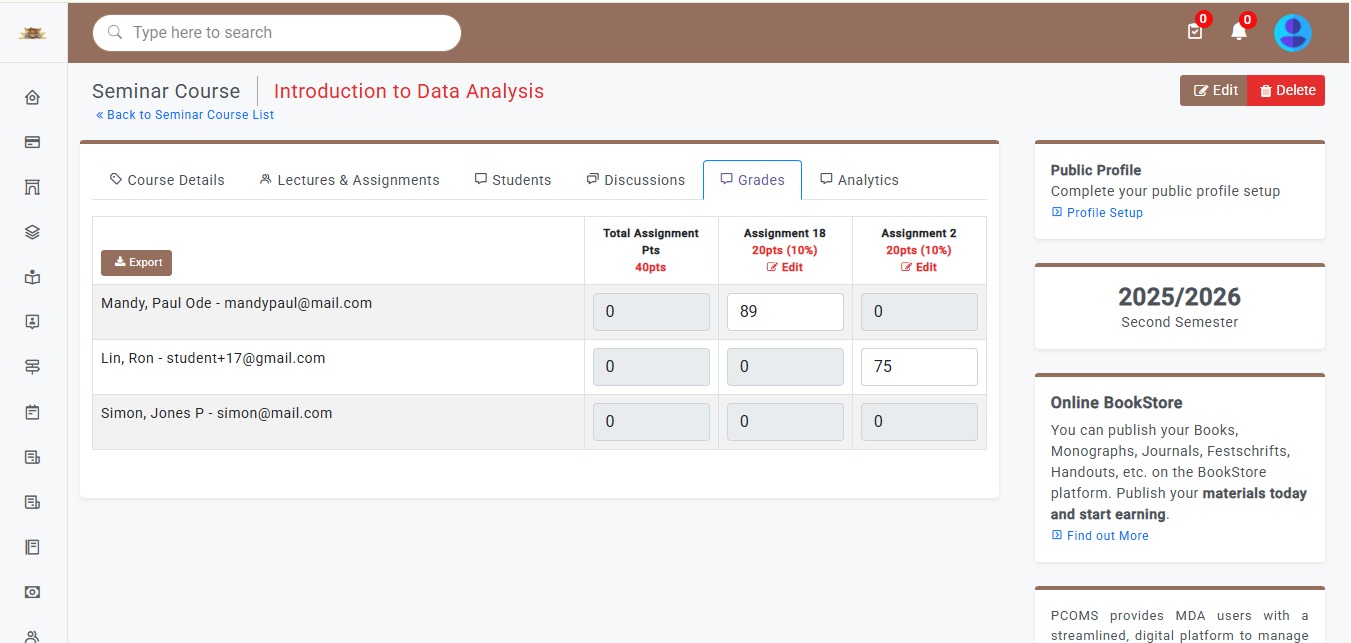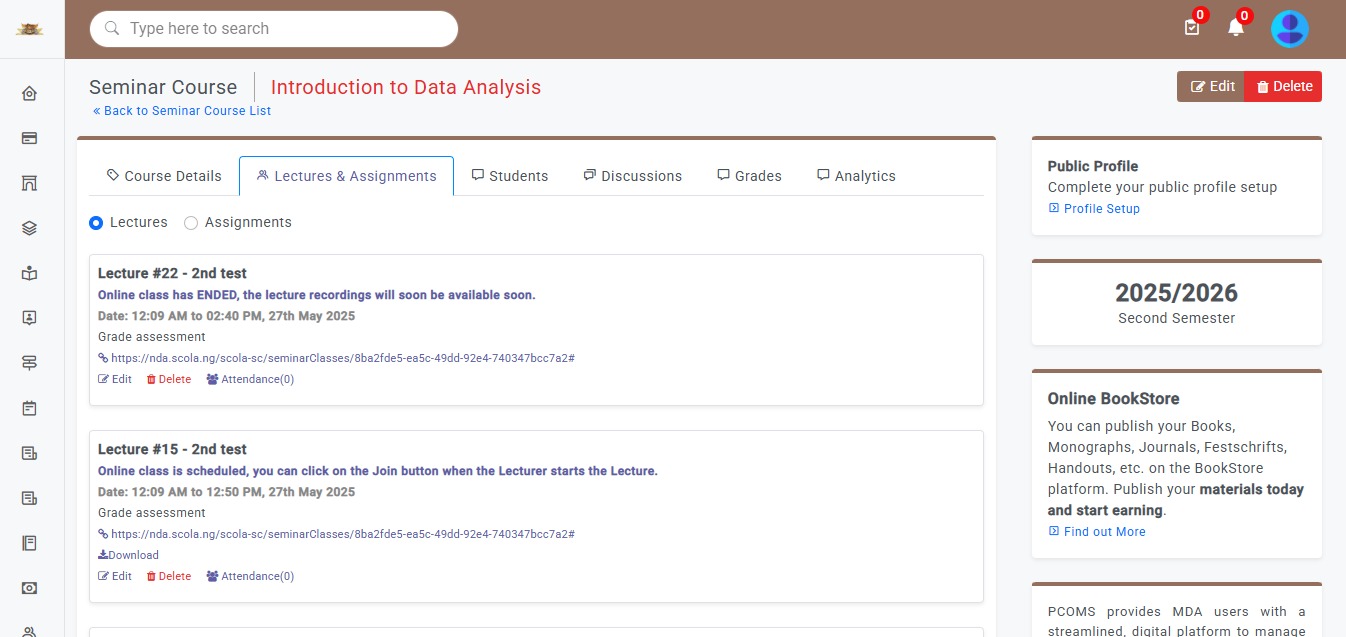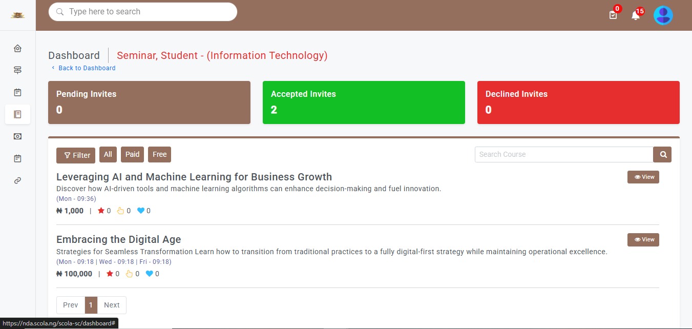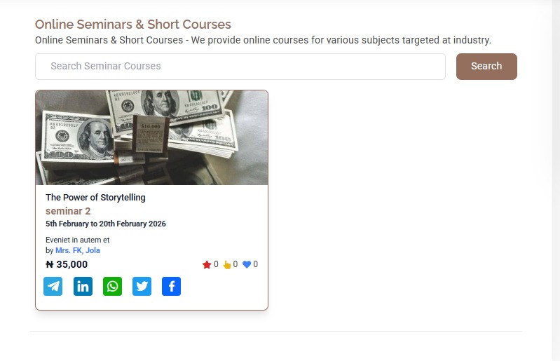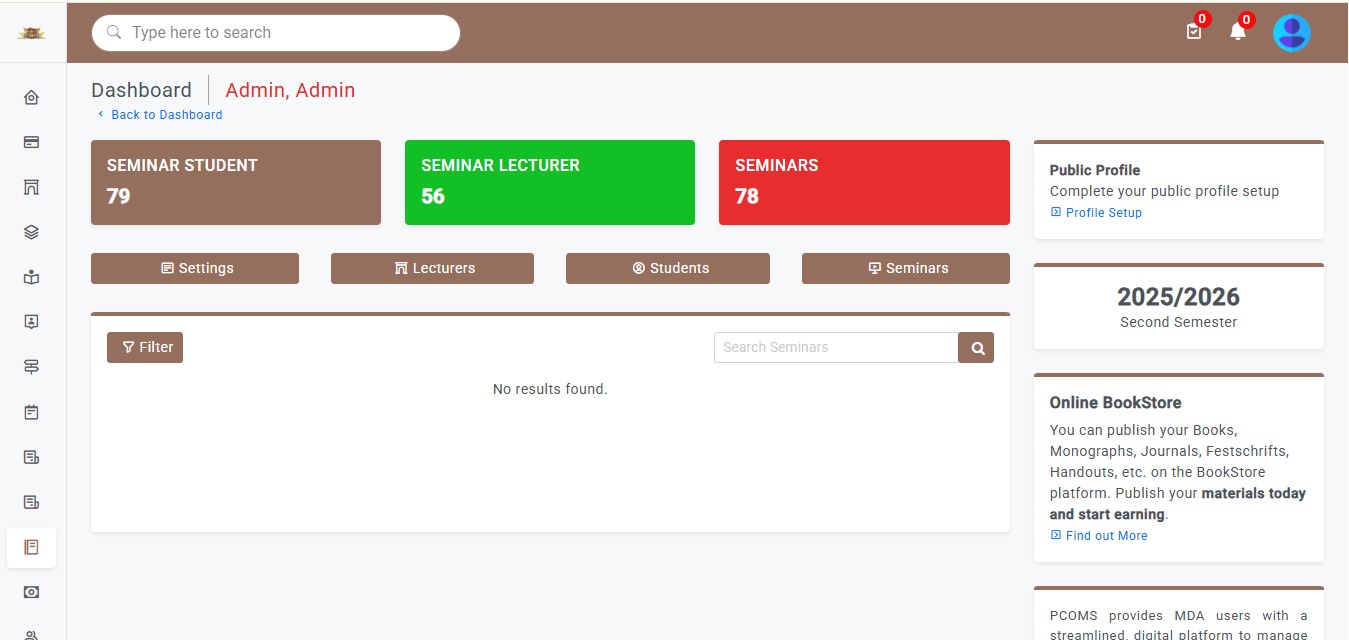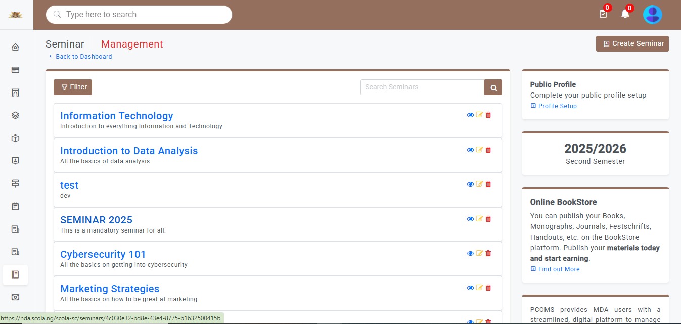 The Seminar module provides a structured platform for organizing, managing, and attending academic, professional, and institutional seminars. Whether physical, virtual, or hybrid, it allows organizers to create events, handle registrations, manage speakers, and share resources, all from one interface. It supports a wide range of events including departmental briefings, guest lectures, workshops, symposiums, public forums, and internal trainings—making it a versatile tool for knowledge sharing across communities.